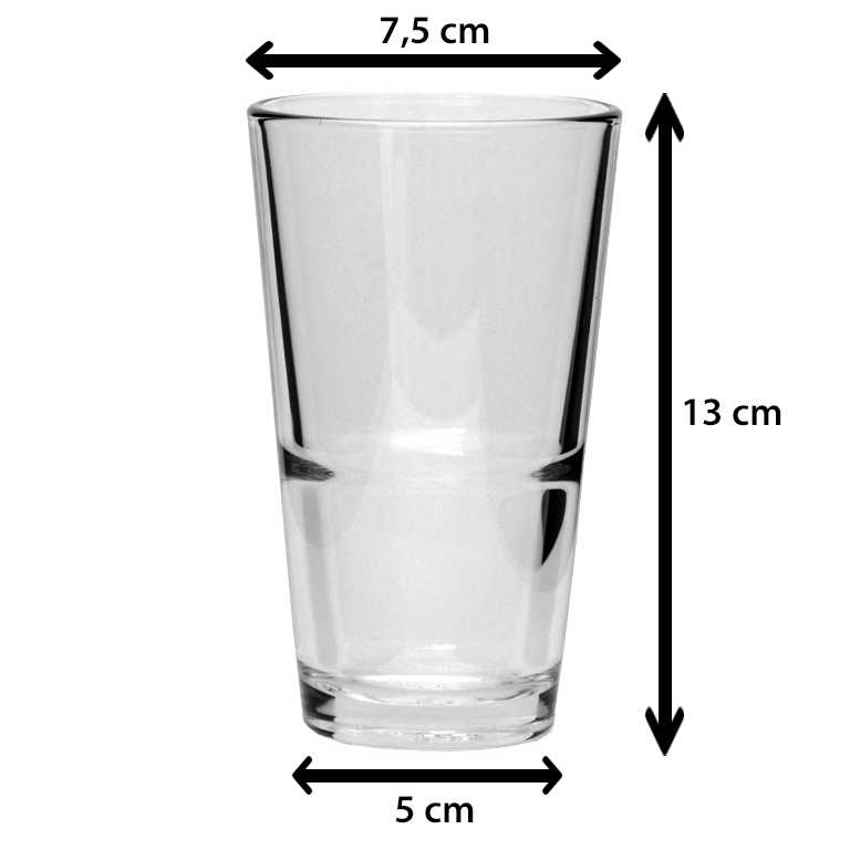 Productgegevens: Set: 12 stuks Inhoud: Tapmaat 20 cl | Randvol 25 cl tapmaat (randvol ca. 25 cl) Hoogte: 13 cm Diameter: 7,5 cm Materiaal: gehard veiligheidsglas Stapelbaar: ja – tevens ook met de longdrinks en spatjes